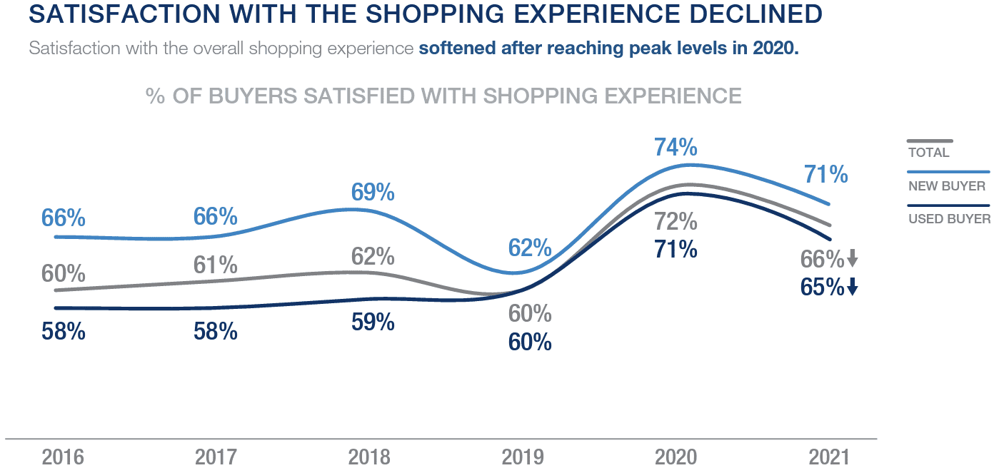Consumers still seem to be more than willing to pay full sticker price, or close to it, for new vehicles. In fact, data reveals that pre-pandemic, 75% of new car buyers paid below MSRP for their vehicles. Today, 75% are paying exactly the MSRP or above. Despite this, Cox Automotive’s 2021 Car Buyer Journey Study revealed that consumers are still more satisfied with their shopping experiences than they were pre-pandemic.