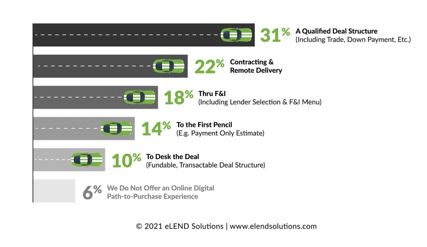 And, that perception shift has advanced the digital path to purchase ‘desired end point’ – another critical step to end-to-end DR: the preferred relative finish of the digital path to purchase experiences now extends much farther down funnel than just the first pencil. A mere 14% of dealers see the DR ‘relative finish’ as the first pencil, with nearly one third viewing it as getting to a qualified deal structure – including trade, down payment, etc.