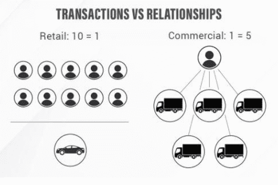 Selling to businesses unlocks a powerful growth engine for dealerships – a “one-to-many” dynamic. Commercial customers, who when they are shopping are definitely in-market, often buy more than one vehicle for their business based on their needs. Plus, these same commercial vehicle shoppers also have friends, family and employees who are vehicle buyers, resulting in one customer and many vehicle sales. With retail buyers, the opposite is true; it’s a “many-to-one” scenario, with up to ten prospects resulting in only one vehicle sale. As you can see, the math is much more favorable for a dealership on the commercial side of the business.