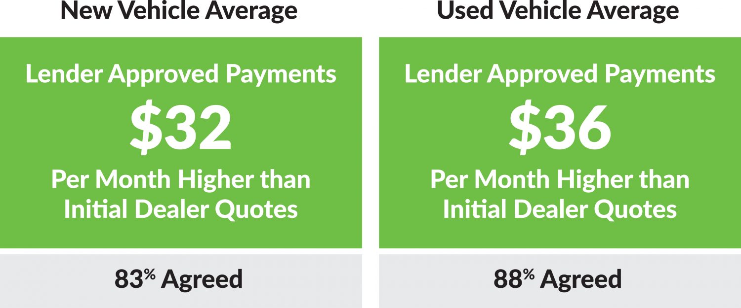 - 88% agreed that lender finance approval decision monthly payments for used vehicles were on average $36 per month higher than the initial offer to the customer.