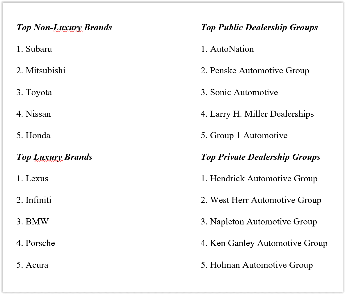 Last year’s report had Nissan and its Infiniti brand taking top honors in both categories. This year’s winners, Subaru and Lexus, both ranked in second place last year. AutoNation held the third-place position last year before climbing to the top spot this year, while Hendrick ranked in first place two years in a row.