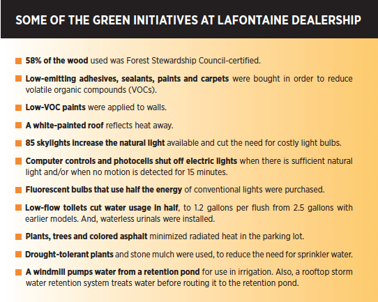 One of LaFontaine group’s first steps with the project (which Ryan LaFontaine recommends that other dealers replicate) was to hire an architect and contractors who work frequently on “green” projects and know the suppliers and how to meet strict LEED requirements.