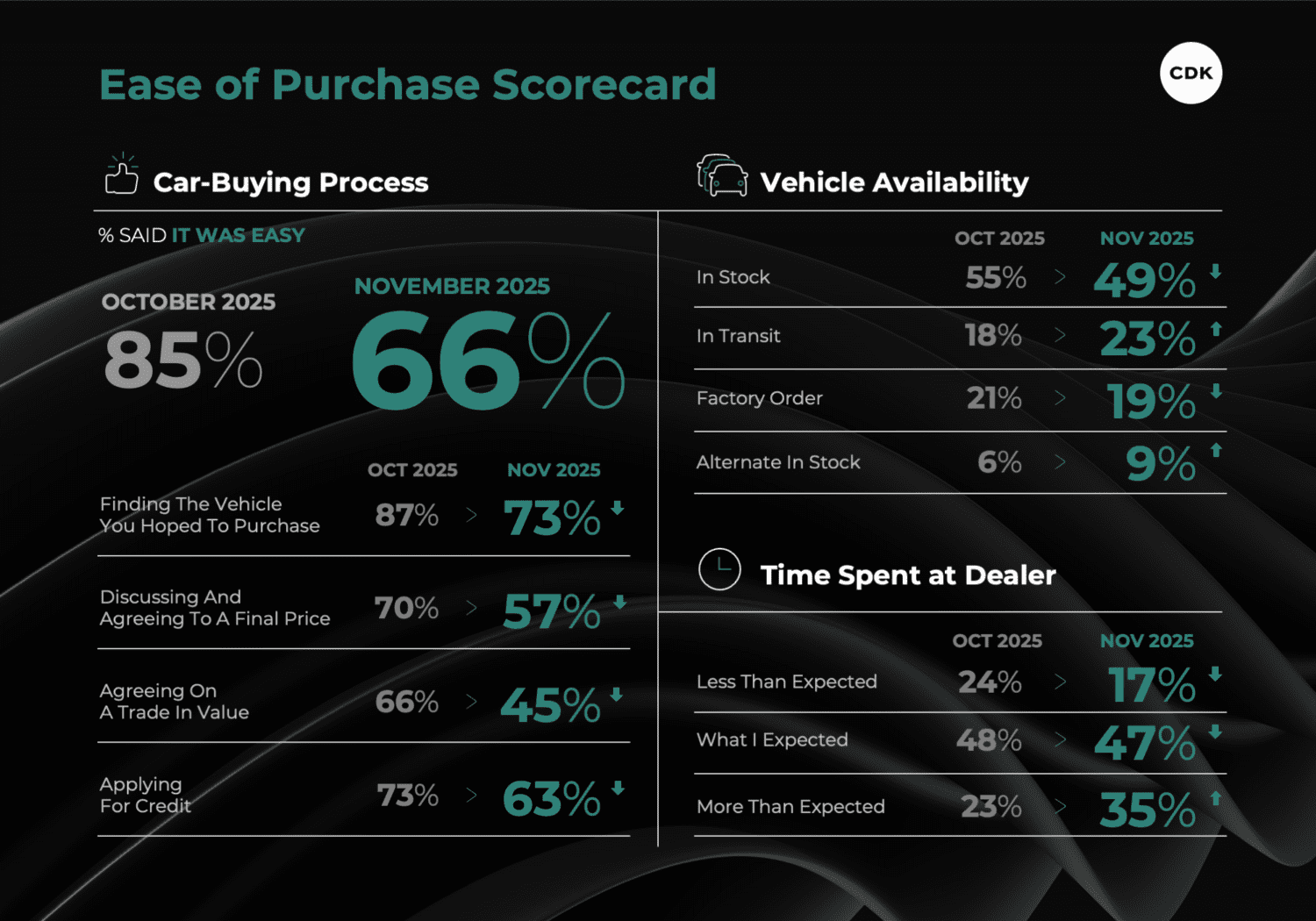 Nearly every step of the car-buying journey experienced double-digit drops. The biggest declines were seen in trade-ins and test drives, with 45% of buyers saying it was easy to agree on a trade-in value, down from 66% in October. Similarly, 65% reported that test-driving a vehicle was easy, falling from 80% the previous month.
