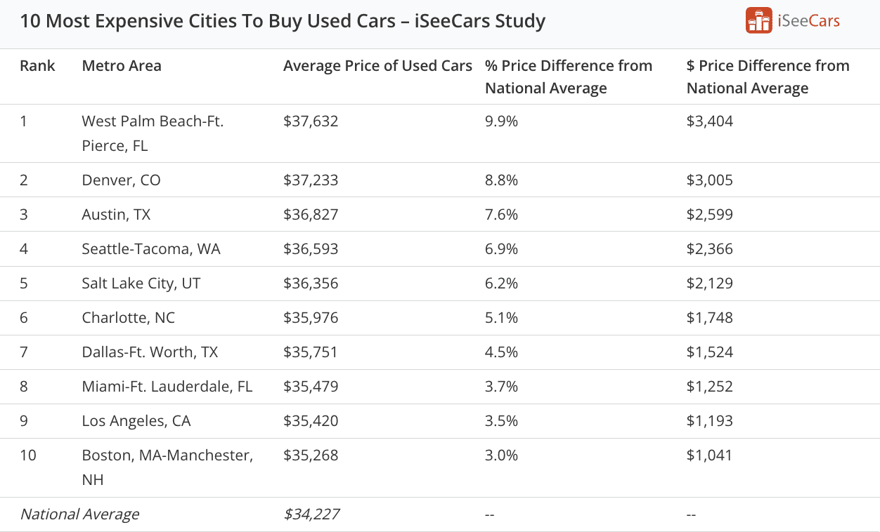 For used car shoppers, “Research and flexibility are two powerful assets,” according to iSeeCars Executive Analyst Karl Brauer. “Buyers in Cleveland and Cincinnati, the top two cities with the cheapest cars, already reside in low-cost cities and have access to local shopping. But used car buyers in the most expensive cities like West Palm Beach and Denver might want to research bus and plane schedules as part of their shopping process.”