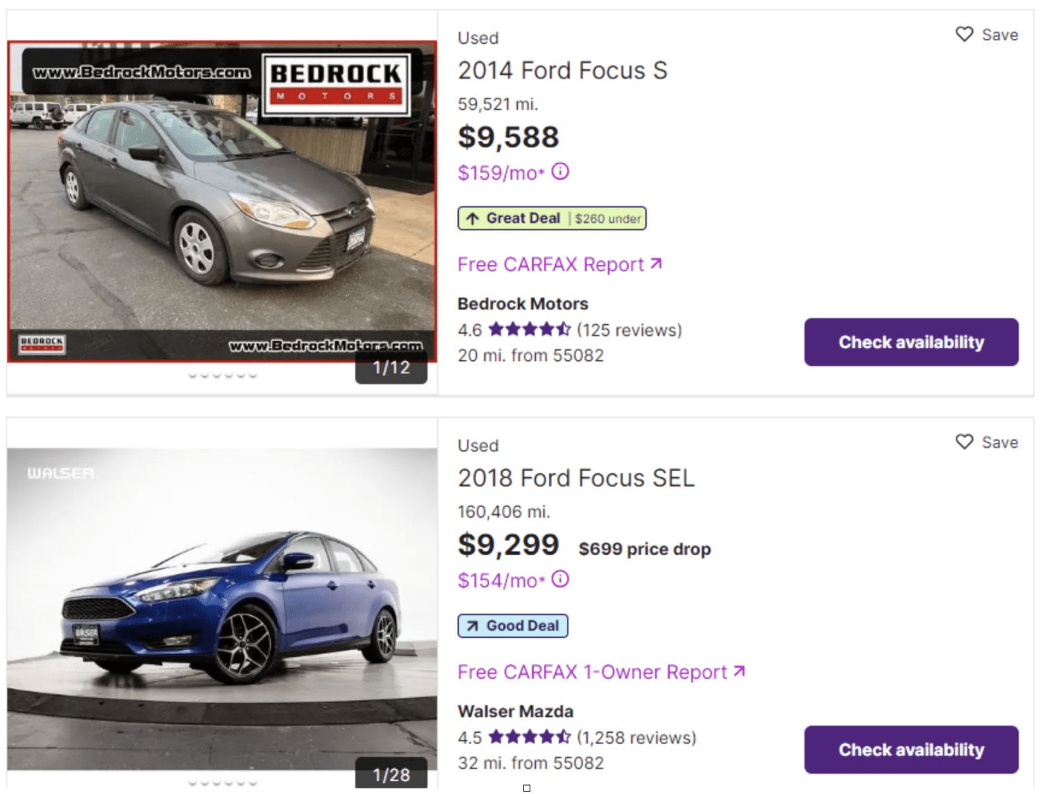 These particular vehicles are a “Great Deal” and a “Good Deal” respectively. There is also a “Fair Deal” on Cars.com that applies to far fewer vehicles. CarGurus has other categories including the dreaded OVERPRICED.