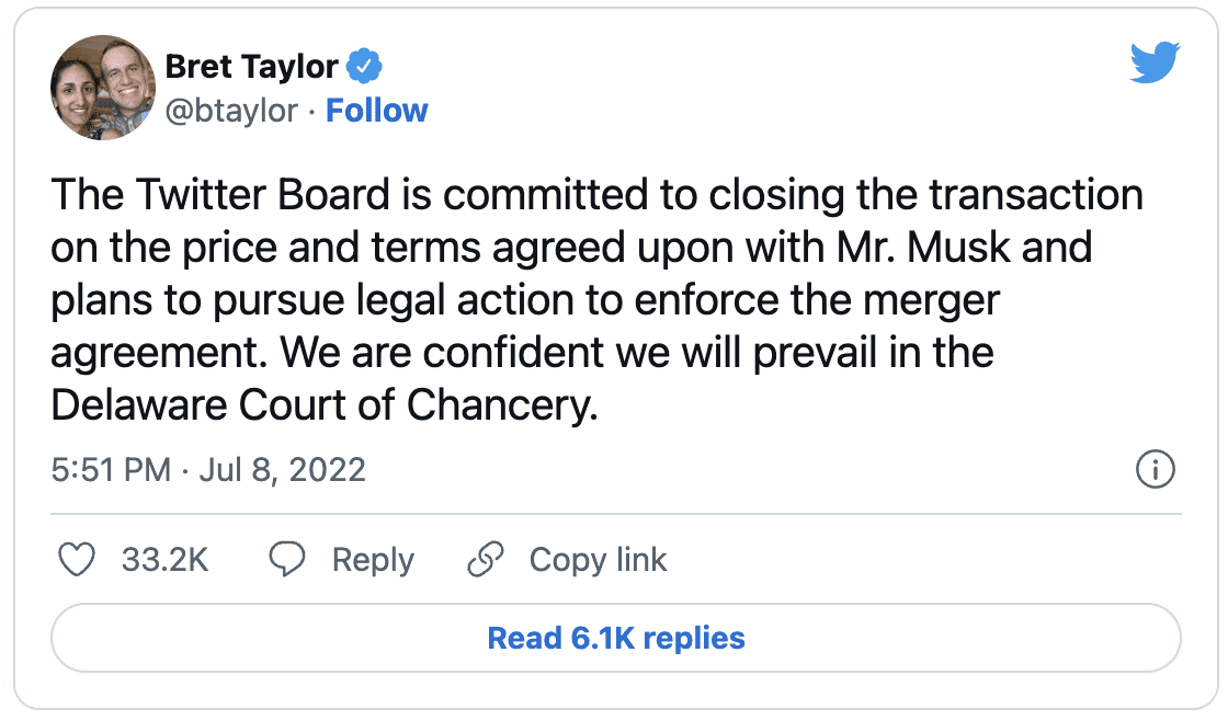 In July, just a few short months later, Musk said he wanted to back out of the deal, claiming Twitter misrepresented the number of factual accounts versus bots on the platform. Twitter promptly filed a lawsuit to force him to follow through on the acquisition at the original offer price, saying his claims were unfounded and that he was merely suffering from buyer’s remorse.