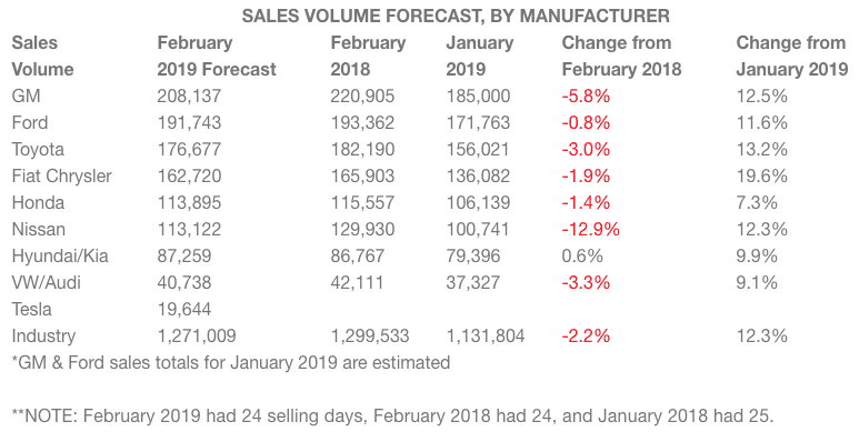 Getting specific, Edmunds released a chart forecasting sales volume by the manufacturer. While all companies showed increases from January 2019, all but Hyundai/Kia showed decreased sales from last February. Hyundai/Kia actually increased sales by 0.6% from last year, even as mainstays like General Motors and Ford showed dips 5.8% and 08% respectively. Nissan’s drop was the steepest, with the brand showing a 12.9% drop from a year ago. When it comes to market share, though the downturns from February 2018 aren’t quite as dramatic, there aren’t any dramatic increases either, with Hyundai/Kia and Ford both making the most substantial difference at 0.2% and GM showing the largest deficit, being down 0.6%.