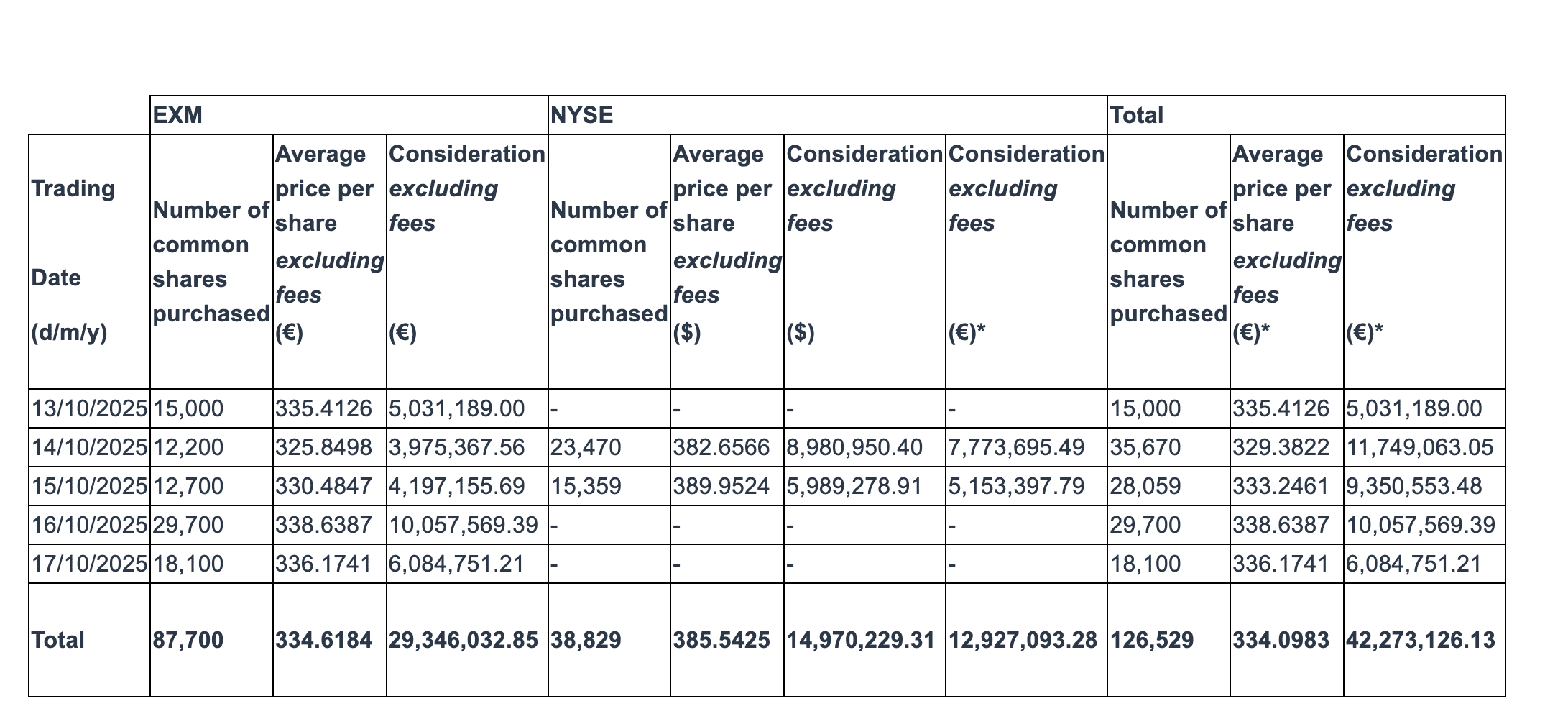 Since the start of the multi-year share buyback program of approximately Euro 2 billion announced during the 2022 Capital Markets Day, on July 1, 2022, until October 17, 2025, the Company has purchased a total of 5,579,082 own common shares on EXM and NYSE, including transactions for Sell to Cover, for a total consideration of Euro 1,862,993,025.37.