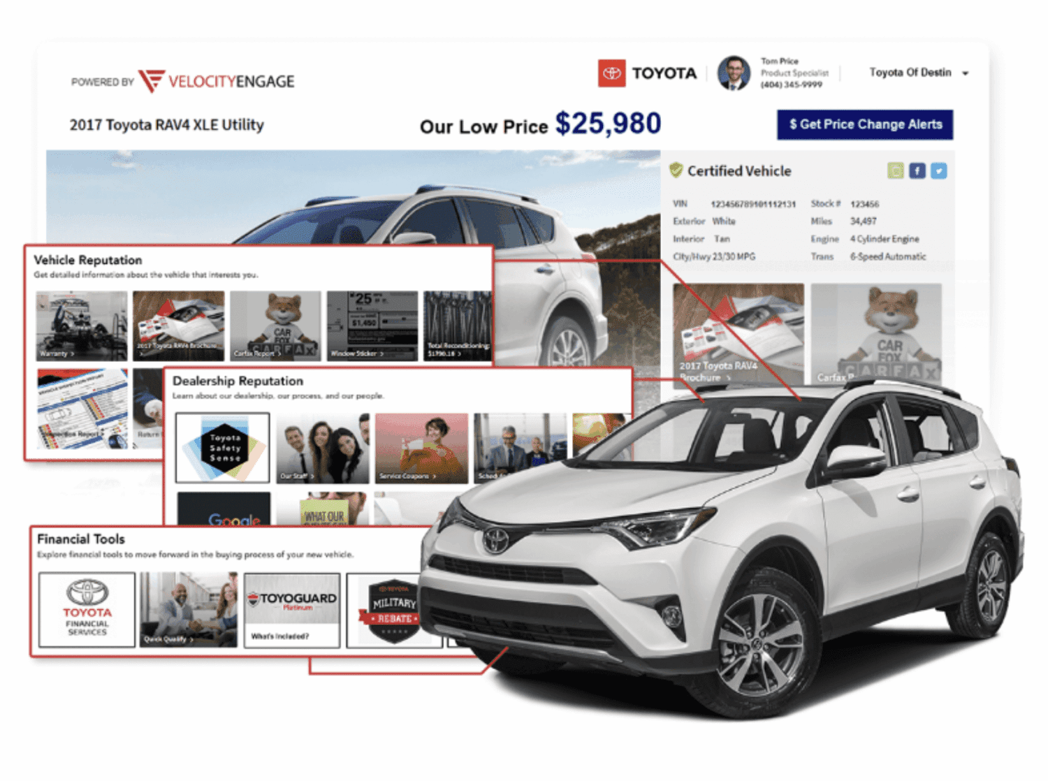 VelocityEngage enables dealers to compete with heavyweight online retailers by delivering all the information that shoppers need on one page, including the OEM Window Sticker, reconditioning records, the inspection report, ebrochure, and other documents and videos – fully customizable by the dealer.