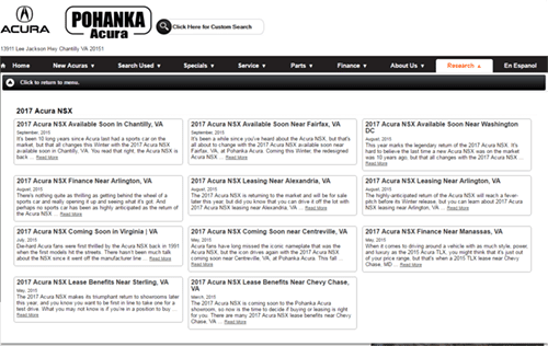 Of course, not all launches are the same. The Acura NSX is a halo car. It was not designed for high unit sales like the MDX, RDX, or ILX. A large part of its purpose is to raise the image of the brand, which can ultimately increase demand for other models. Leading Acura Dealer, Pohanka Acura, created a plethora of unique content for the NSX tailored to communities the store competes in. The graphic below shows all this content linking from the main menu bar (via mega menu) for superior SEO advantage. Any content linked directly from the main menu bar of the website is seen by search engines as having more authority than if it had not.
