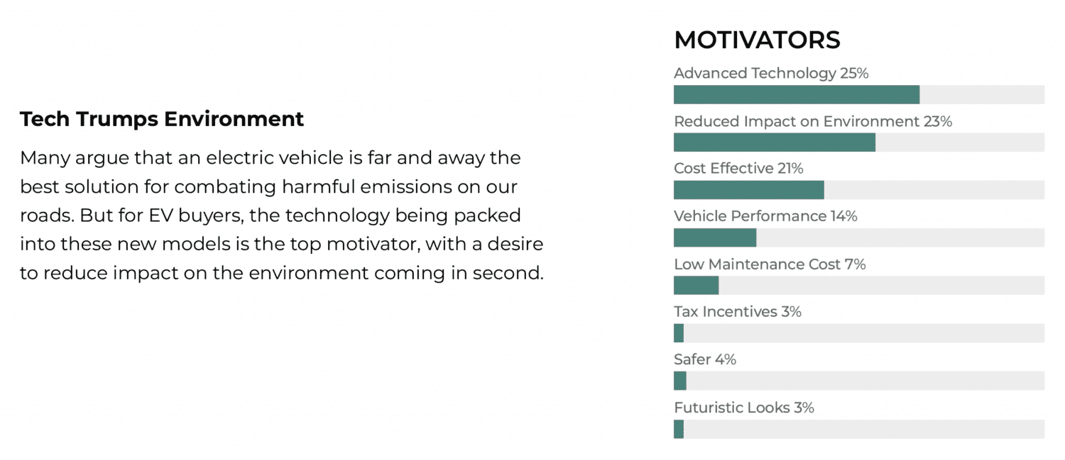 “You might be a little hesitant to go all in,” Thomas says, “so you lease, but only 8% of EV buyers actually leased.” The tech is why people love EVs, not necessarily eco-friendliness, to some disappointment.
