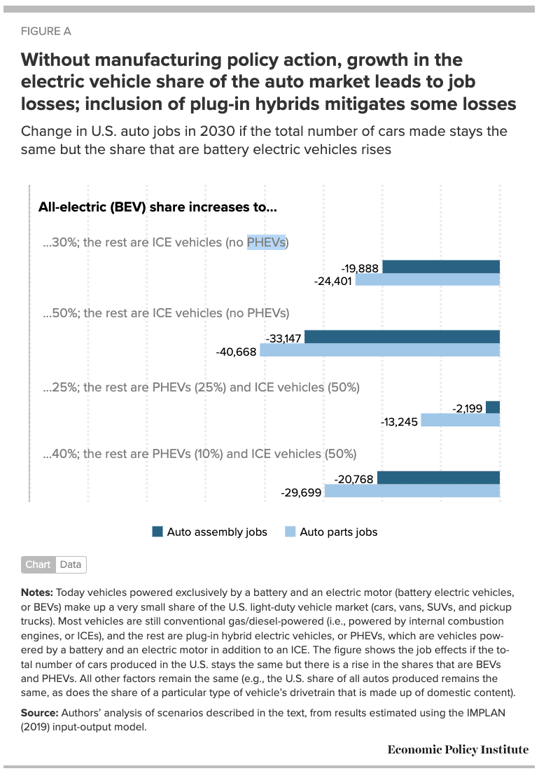 In a report issued last September, the Economic Policy Institute stated that employment would decline in the automotive sector without new policies supporting EV production. The group estimated the cost of inaction could be 75,000 jobs by 2030.