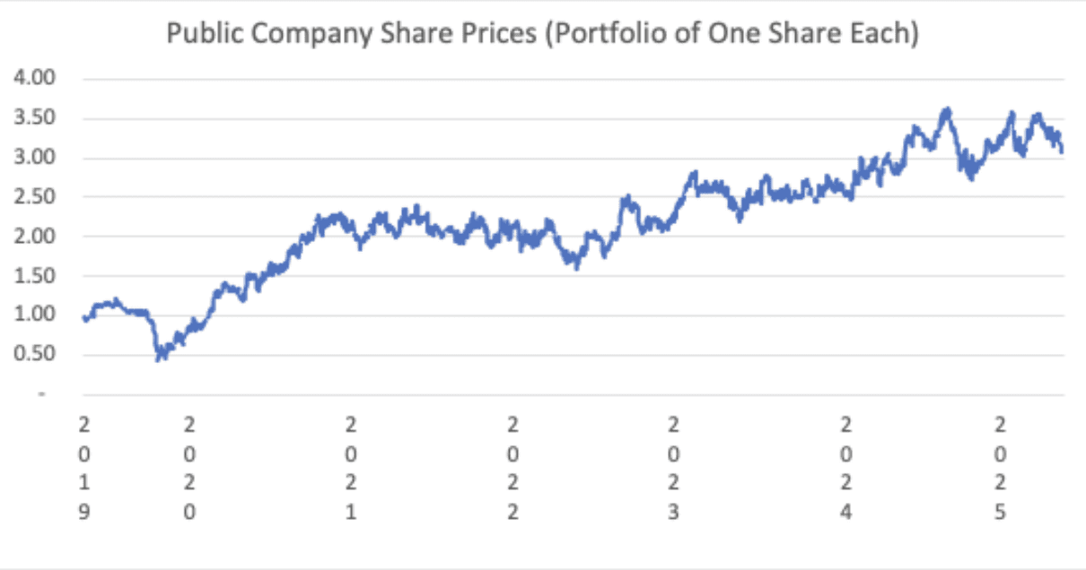 According to the chart above, the market views automotive retailing as a strong business. Average public retailer blue-sky multiples have moved up significantly from the concerns of the early Covid period and now hover at about 7x, above the valuation for the average single-point new car dealership. Further, it has been on a slightly rising trend as per dealership earnings fell post Covid. On an absolute basis, see the chart below, public company share prices have been rising.
