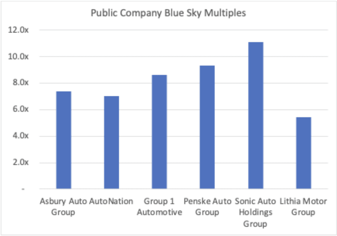 To that end, I estimated the blue-sky multiples for the public companies. Public companies are evaluated daily by a broad group of investors who value these assets in a myriad of ways. Car dealers may have an emotional bond to the industry, but investors just want to make money. The tables below show how the market truly feels about the future of automotive retailing.