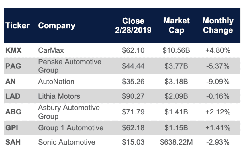 Ryan Kerrigan: Well, it was a mixed bag. Three of the component stocks were up, CarMax, Asbury, and Group 1. However, AutoNation, Penske, Sonic, and Lithia were all down for the month, with AutoNation being down the most, at 9.1 percent.