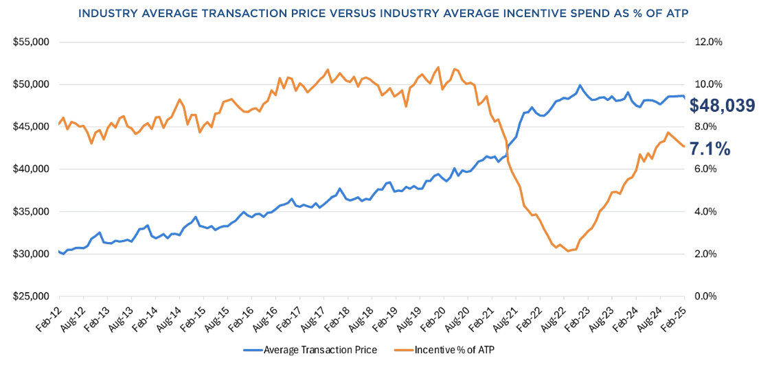 According to Cox Automotive Executive Analyst Erin Keating, affordability remains a challenge, with ATPs up 25% since February 2020. Meanwhile, incentives have declined 13% over the same period, and higher auto loan rates continue to strain household budgets.