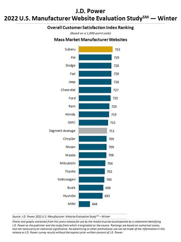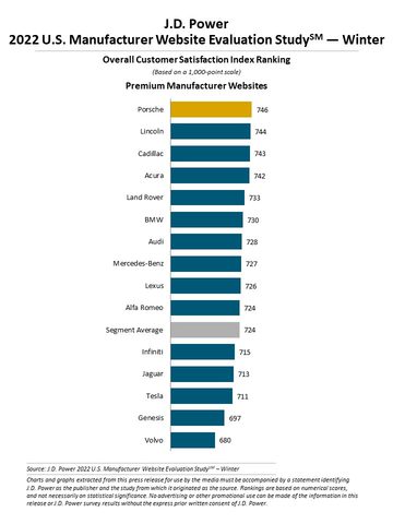 A recent J.D. Power study conducted in October and November of 2021 showed that consumers’ satisfaction with manufacturers’ websites is below par, with overall satisfaction for the premium segment being an average of 724 out of 1,000 and overall satisfaction for the mass market segment being 711 out of 1,000. In the premium segment, Porsche fared the best with an average satisfaction score of 746, while Volvo ended up last with a score of 680. In the mass market segment, Subaru topped the list with a score of 733 and MINI ended up last with a score of 680.
