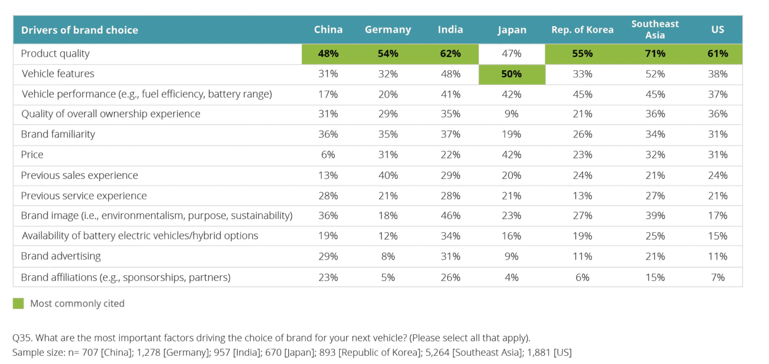 The Deloitte study revealed two significantly intriguing insights. In the U.S., product quality is the top deciding purchasing factor for car buyers (61% of respondents). This ranked much higher than aspects like price (31%) and even quality of overall ownership experience (36%). According to this study, consumers are less concerned about the experience (even though it is still important) and care more about the product.