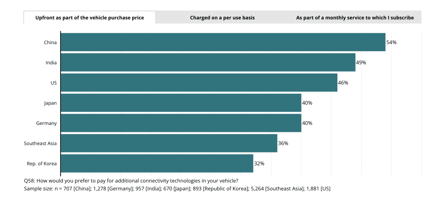 Only 20% wanted monthly fees, while 33% preferred to only be charged when they used the service, and 46% wanted to pay the price upfront with the total vehicle cost. The top connected feature U.S. consumers wanted (60%) was maintenance updates and health alerts.