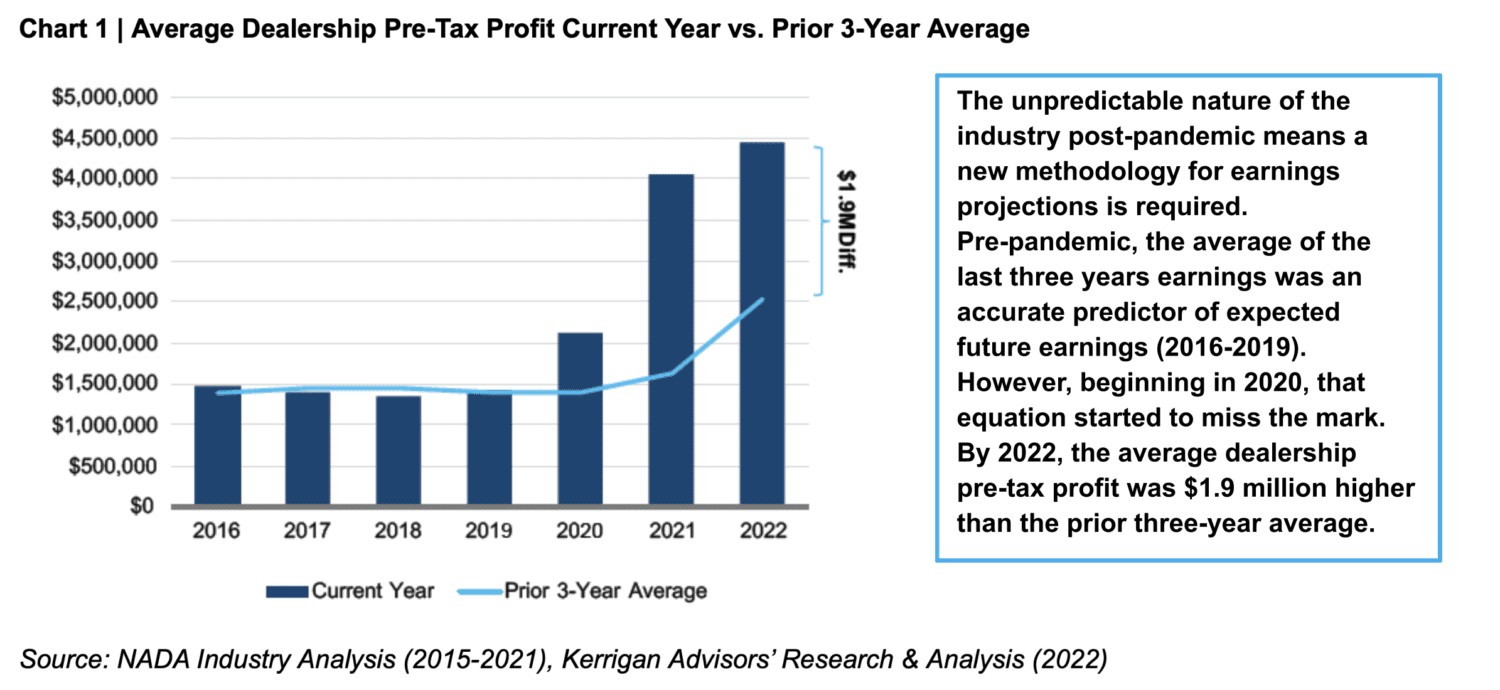Auto retailers have commonly averaged the last three years of earnings to estimate expected future profitability. This methodology proved to be an effective predictor of future earnings for the years leading up to the pandemic (see Chart 1). However, beginning in 2020, when earnings commenced their hockey stick progression, the calculus for projecting future earnings based on the last three years of profits started to miss the mark. Buyers and sellers have since struggled to assess future earnings given the seemingly unpredictable nature of the industry post-pandemic. It appears that the past is no longer prologue, and a new methodology for earnings projections is required.