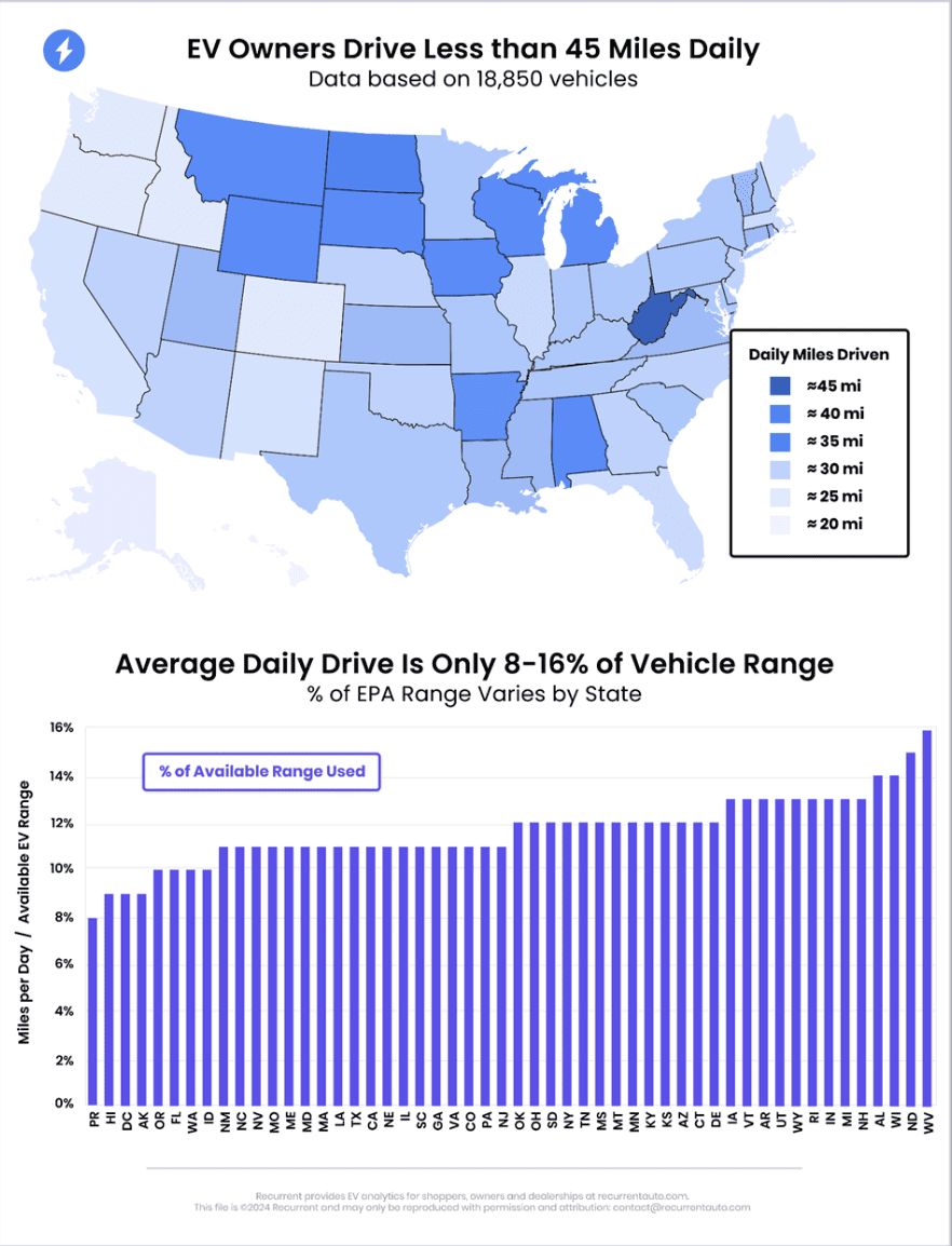This study found that Americans drive fewer than 45 miles per day on average. Even in urban areas, where commutes are longer, or rural communities where routine trips can be longer, people are using only 8-16% of their EV’s range.
