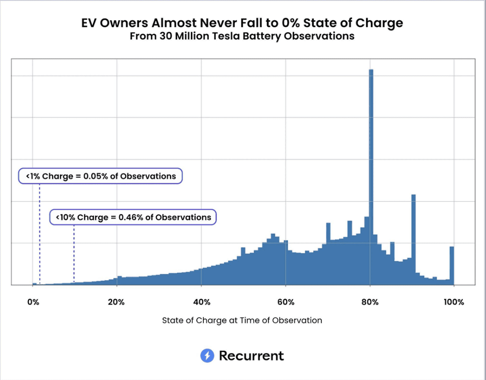 Recurrent looked at data on how often real drivers let their range drop into the danger zone. In the 10,000 Teslas in the Recurrent owner community, we’ve only observed a SoC under 1% in less than .05% observations. We’ve only observed a SoC under 10% in only 0.46% of our 30+ million observations.