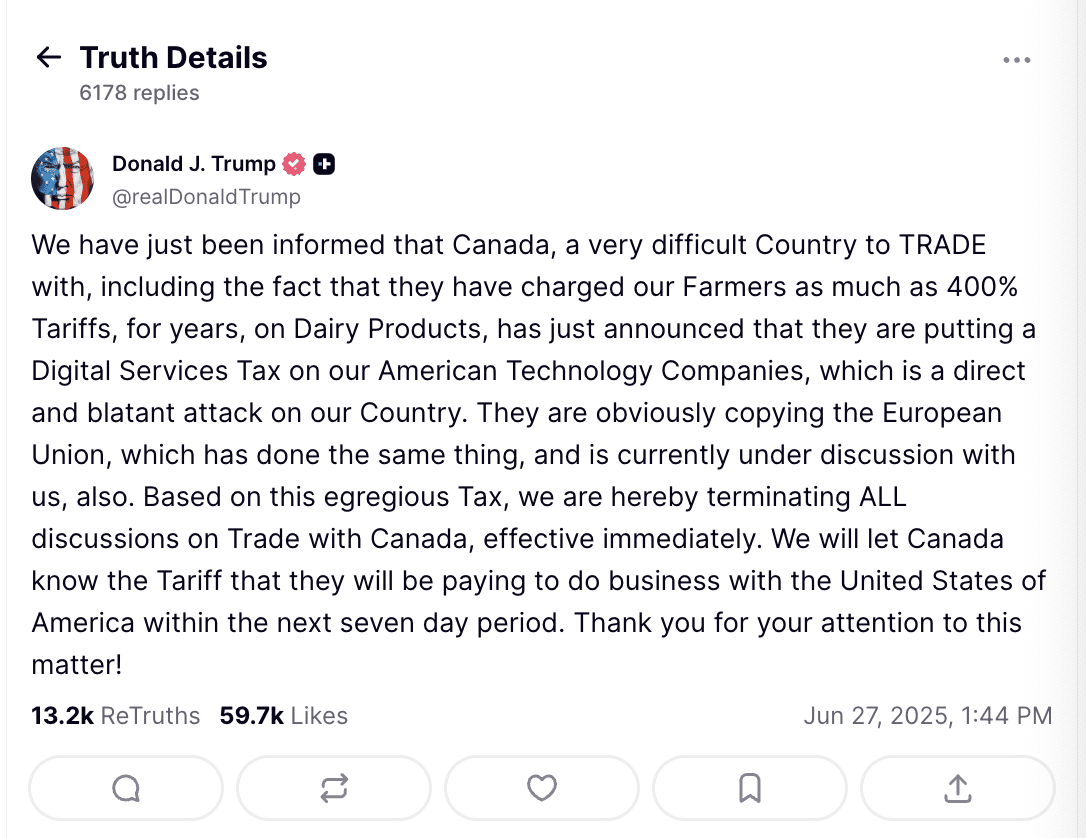 “Based on this egregious Tax, we are hereby terminating ALL discussions on Trade with Canada, effective immediately,” Trump posted on social media. “We will let Canada know the Tariff that they will be paying to do business with the United States of America within the next seven-day period.”